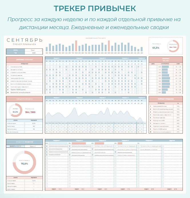 Сохраняйте последовательность и мотивацию в формировании полезных привычек с помощью этой таблицы Habit Tracker. Этот шаблон, созданный для того, чтобы помочь вам выработать привычки, является идеальным инструментом для достижения целей, позитивных изменений и улучшения вашего образа жизни. Он включает в себя только самое необходимое и при этом прост, понятен и визуально привлекателен. Всё, что вам нужно сделать, — это настроить свои привычки, отметить галочками нужные пункты, а всё остальное будет рассчитано автоматически!